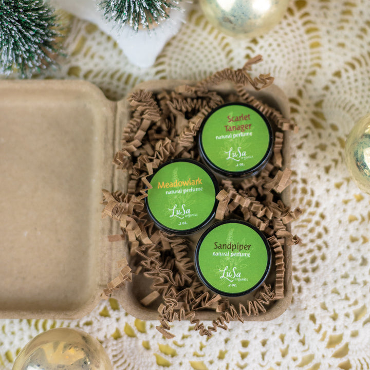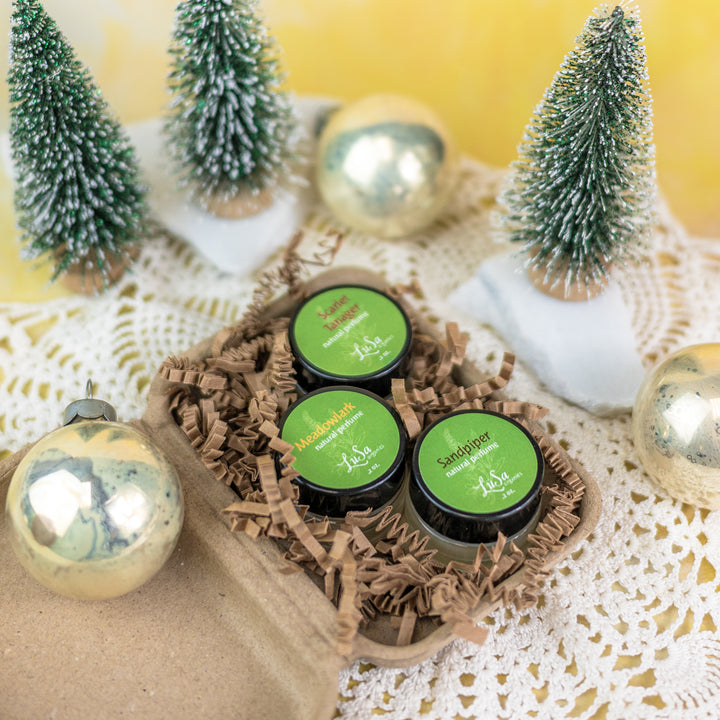 Three .2 oz. glass jars packaged in a recycled paper gift box with paper ribbon.