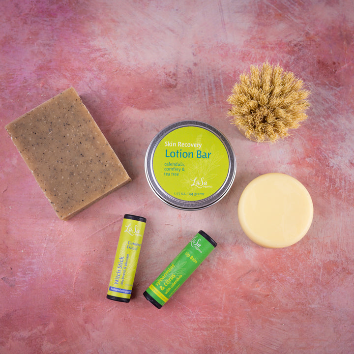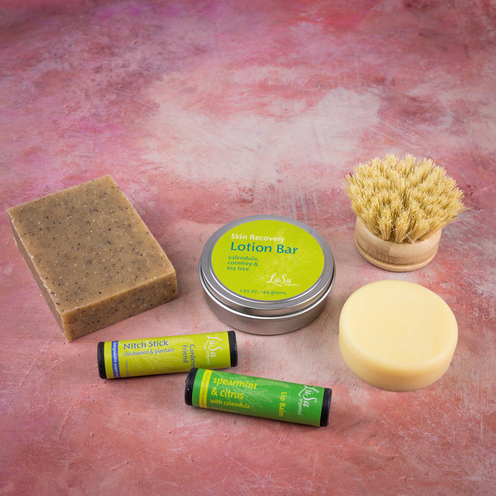 Kit includes: N'Itch Soap (for bramble-raked and bug-nibbled skin), N'Itch Stick for those same itchy spots; Skin Recovery Lotion Bar to protect, soothe, and moisturize; a biodegradable bristle brush for cleaning nails, hands, and feet; and our favorite Spearmint & Calendula zero waste lip balm.